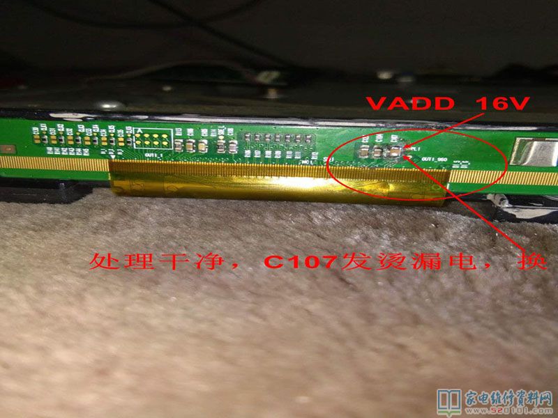 本次维修总结:该机是屏边板进水霉烂,VADD16V电容漏电引起故障。更换后故障排除。