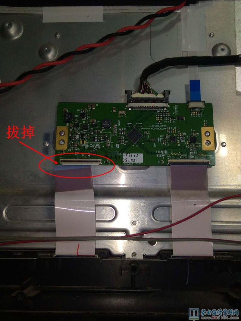 还是测一下电源电压,主板的小电压,都正常。先处理一下排线,屏接口扁排,故障没有改善,还是灰屏,测逻辑板上屏12V正常有,VDD 3.3V有,VADD只有2.7V不正常,VGH=0 VGL=0 VCOM=0,此逻辑板有两排上屏接口,为了确定故障在逻辑板,还是屏电路,拔掉左边扁排, 测逻辑板电压,五供电全部正常有了。再看屏,右边已正常显示。