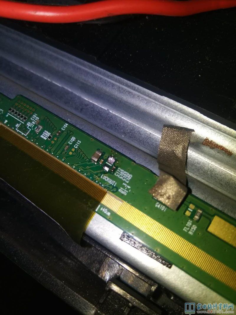 接修一台康佳LED42E330N液晶电视,故障表现为声音正常,背光也亮,就是无图。拆开机器初步检查了一下,主板各路电压正常,逻辑版12V正常,但边板上各路电压明显偏低,只有零点几伏 。进一步查边板,发现存在短路。最后查出是一个贴片电容击穿了。 去除之后测试并无不妥。后来开机烤机一段时间也一切都正常,交付给客户使用。