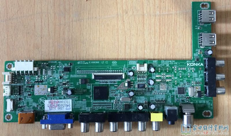 另外说明一下,该机后壳串号为LBG1216K30380811B9G5,主板为35016701 REV-00,2012.03.05。屏:KONKA KPL+420B1CE12 P/N:72000570 V0。灯条型号:35016356 KPL+420B1CE12。