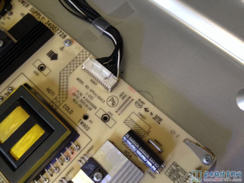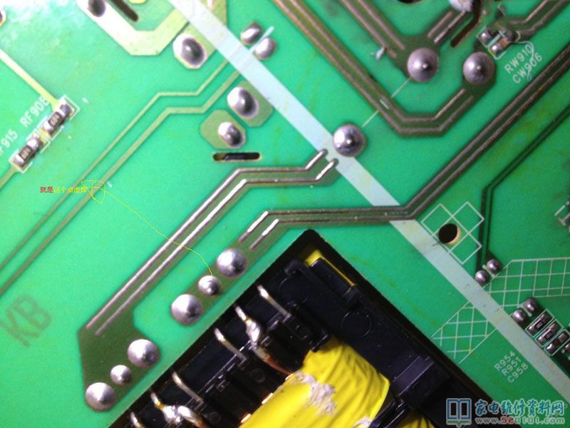 不过今天遇到机器还比较容易找出故障,发现出故障时候12v消失的,这时候测试发现主板给电源板的开机信号并没有消失,这就将故障锁定在电源板。过后查出是下图中12V开关变压器主绕组脱焊导致。