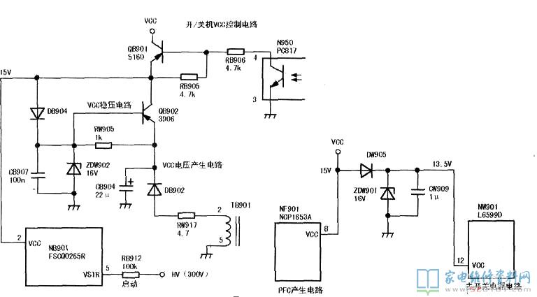 如下图所示,开机,5V指示灯以1Hz频率闪亮,5V电源几乎无电压。测NB901②脚电压在7V~10V之间波动,但QB901的c极无电压。试将其e极与c极短路,5V指示灯不再闪亮,怀疑VCC电路有漏电或短路故障。在QB901的c极处外加12V电压,12V电源立即下降到5V,证明VCC电路过流。副电源开机后输出的VCC电压一路为PFC电路NF901(NCP1653A)供电,另一路为主开关电源电路(24V和12V电路)NW901(L6599D)供电。断开为NW901供电的线路,在VCC处加12V电压,无异常,说明PFC,电路的NF901正常。