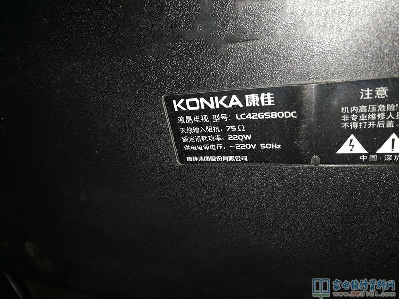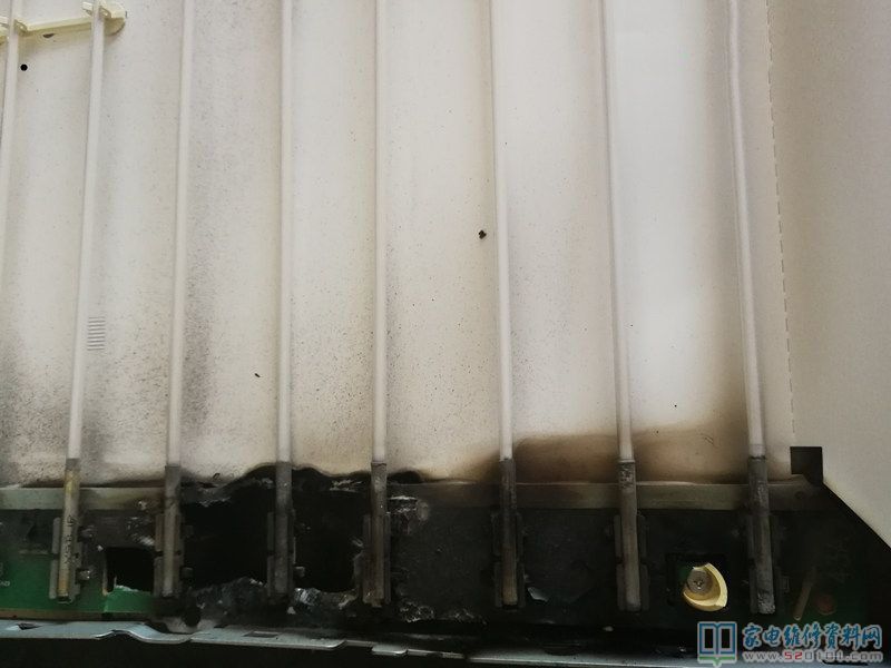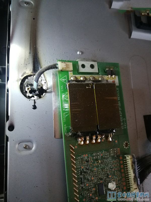 接修一台用户送来的康佳LC42GS80DC液晶电视,用户说观看电视的途中冒烟,拆开机器打开后盖看到高压板到灯管之间的线路已经烧焦。抱着捡漏的想法拆开一点铁皮,准备不拆屏修修试试看,后来发现根本行不通,只好老老实实拆屏。拆屏后看到灯管座子下的三分之一部分板已经烧毁,灯管估计也有坏的。灯管好办,42寸灯管手里还是有很多的,灯管座子以前拆电视时一块也没留下,看来以后不能扔了。