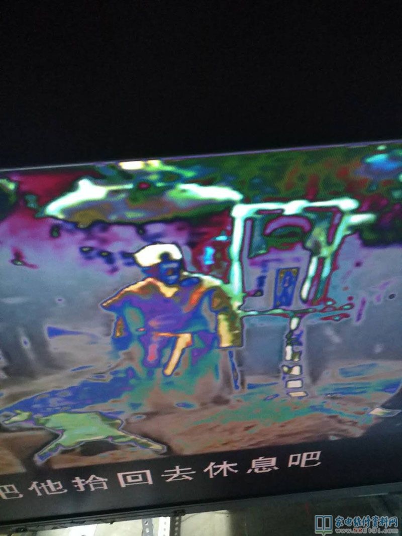 首先怀疑屏参有问题,使用KK-Y313C遥控器,先按“菜单”,在3秒内连续按5次“回看”进入“工厂模式”,“静音”退出并记忆数据,但调整无效。接下来“百度”,说是主板动态帧存储器有问题会出现类似现象,更换之,没有效果。网上淘了块主板,没有用。