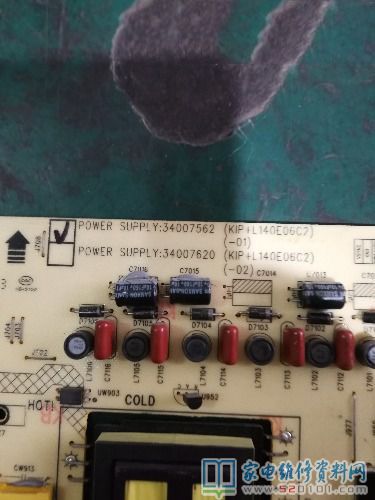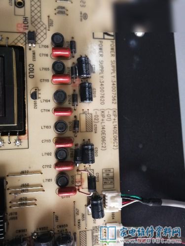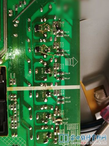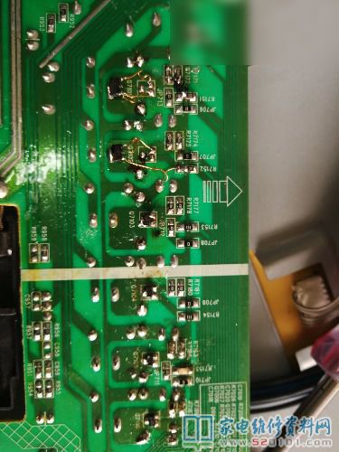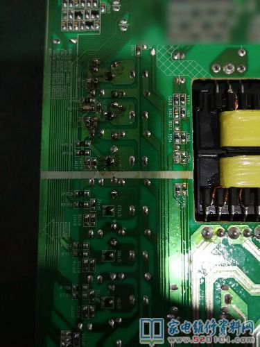接修一台42寸康佳LED42M505DC液晶电视,图像左上角暗,按正常经验,判断为灯条问题或灯条电压低。拆盖欢察了一下LED灯条电路,发现该机由六块异形LED灯板组成背光灯。用LED灯条灯珠测量仪测量了六块灯条,判断六个LED背光灯正常,是电路问题,测量LED背光升压二极管发现击穿二只,控制场效应管连带损坏,同时场效应管的漏极四只8点2欧电路断路,栅极限流150电阻烧毁,没有相同配件,从旧板上拆了二只功率大的N沟道场效应管代换,二极管用三安培代换,安装无误,试机正常。