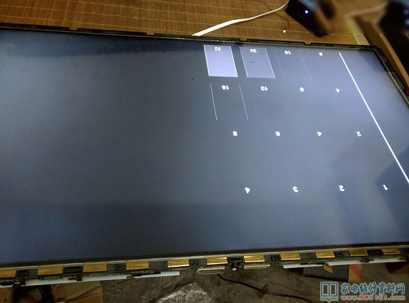 液晶电视修的不多,百度及网上搜索补脑,初步确定是竖向驱动故障,可能是选址缺陷引起的。估计是电容漏电,主板RAM或是逻辑板至屏选址故障。