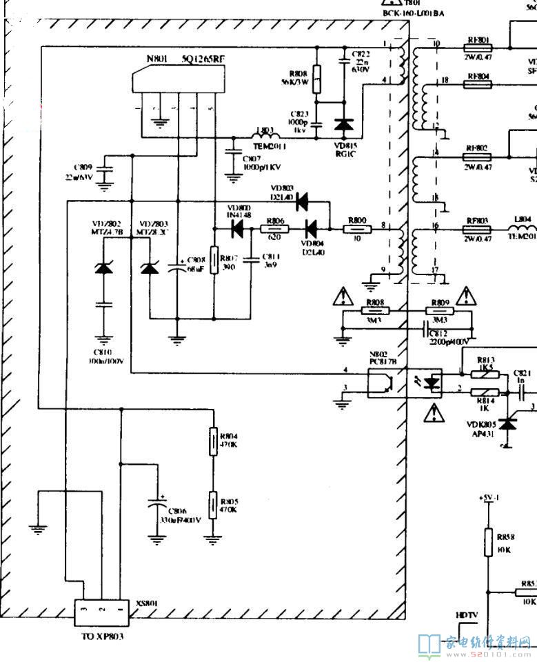 接修一台康佳LED 42液晶电视,其板号是35016895(三合一板),据用户说看1小时后灰屏有声音,别处未修好转我处,开机三无查电源一片狼藉,电源管和芯片已无踪迹。无奈先搞电源,用手头的CQ1265改吧,1脚接300V,2脚接地,3脚接6755的6.8脚,4脚接光耦,5脚接2K地.反馈电源RF104.2K电阻.470P(与地).1N4148接5脚改装完成后开机时屏一亮一暗。测电源,12V从6.5V升12V又下降6.5V,100V从70V上升100V又下降到70V,循环如此,查背光取样电阻R742和R746便大(1M),更换后正常。