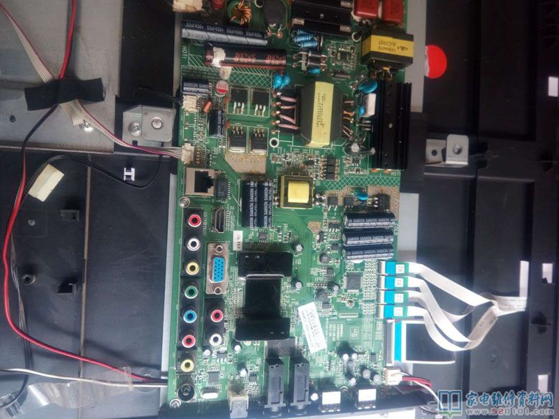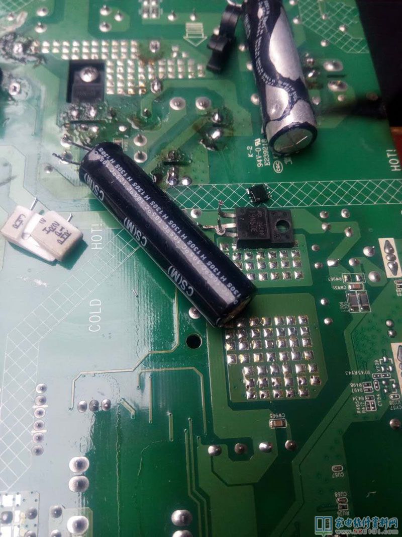 接修一台康佳LED46R5100DE液晶电视,故障表现为开机三无,开盖查看炸得还蛮凶的,保险F901 3.15A/250烧得不见了,黑了一片。限流反馈电阻FR913 0.12Ω/2w裂了,PFC电容CF917 CP919 68UF/450V*2暴浆,PFC斩波管VF903 击穿 PFC电源管理ICNF903 FAN7930C损坏。 除FR913 0.12Ω/2w没有,用0.68Ω/0.5W*4并联代换。其他元件都有全部更换。检查电源其他相关元件正常。
