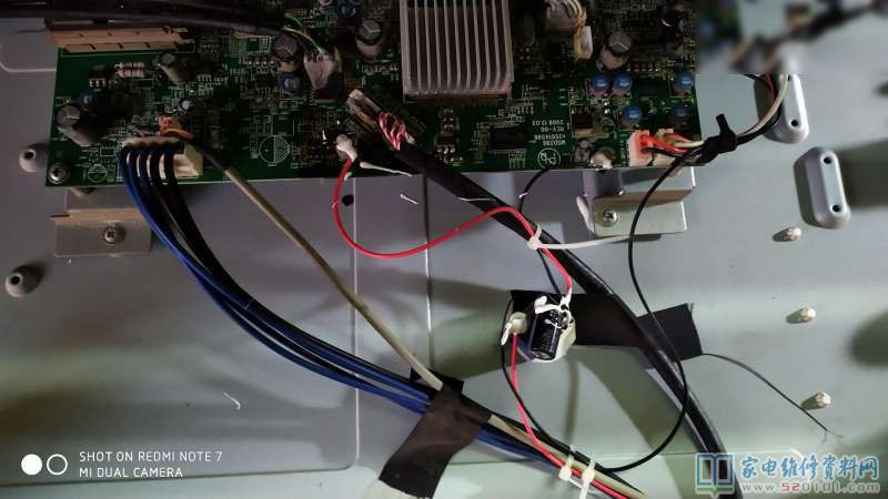 大家以为就这样结束了?当然不是,合起盖子(此机不和上盖子,插上后盖排线没声音)反复开关机测试,图像是正常啦,可是声音有一半概率没有,这下主板故障概率就很大啦。再次开盖检查,伴音块子MSH9000芯片的静音脚(26脚),测试发现,不管有声还是无声都是12v,但是供电正常,继续一同折腾发现,无声时把26脚对地一下再断开,伴音正常。既然这样就把26脚外围电路断开,串47K电阻接到12V屏边板,也是上电再断电再上电,反复开关机,声音图像全部正常。