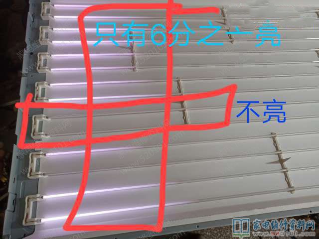 接修一台康佳LC37FS30B液晶电视,故障表现为开机亮一下就灭了,这个肯定是高压板坏了,其电源板板号34006703,首先换高压板,但故障不变,难道是灯管坏了?开屏后通电开机发现灯管是14根,有12根只有6分之一亮一下,灯管两头也有发黑,用创维37L05HR的灯管先换几根,故障不变,当代换2根全不亮的灯管后,故障排除,后发现其中一个不亮,做实验,断开一根灯管,开机灯管只有6分之一亮,说明这个灯管开路了,也说明这个高压板在灯管开路或者短路的情况下,都是开机亮一下就灭了,灯管全部换掉之后,故障修复。