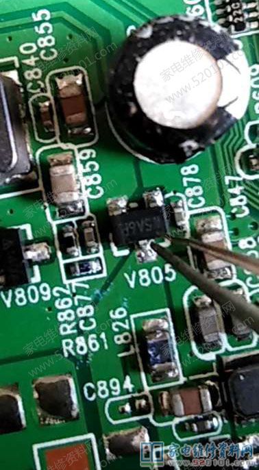 几翻折腾之后,还是无法判断是CPU信号问题,还是V809的问题。把困惑告诉师傅,师傅说把V805换掉就好。又告知这是一个P沟道场效应管,上屏电压处的那个可以换上用,找一片旧板,拆下换掉,电视正常,故障修复。