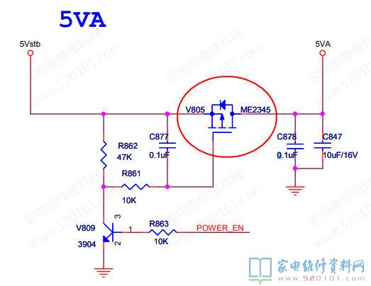 我就按图纸,仔细检查每一个小电压,发现只有5VA电压不对。按图纸所标,应该是输出5V的电压,但只有3.89V。在这一块电路测量时,突然电视自动开机,亮屏,正常开机。心里很高兴,知道故障就在这一块了。