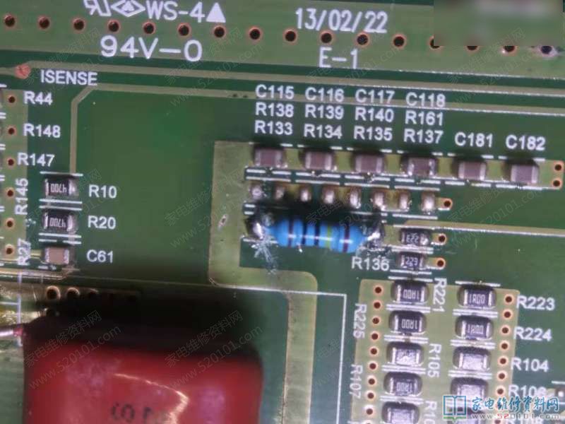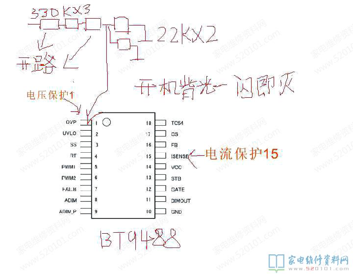 查脚位资料,最后测得到电压保护1脚的上拉电阻R133、R135,电阻开路。上拉电阻 为3个330K贴片串联一时找不到。后用1M 1/4电阻代替。背光正常点亮。