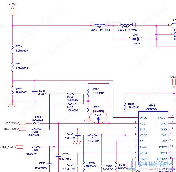 再检查恒流电路,该机恒流使用OZ9902,13脚为过压保护,把这个脚用2K电阻接地试机,灯条可正常工作,一时不知道该怎么继续了,继续看图纸,9902还有一个保护是1脚,对恒流电路供电VCC进行检测,查资料这个1脚是VCC供电欠压保护.可是我刚才已经修复了供电啊,102V非常稳定,不可能欠压,所以有可能这里的取样电阻有问题,首先拆下RW709,标注为225,2.2M,实测有时正常,有时下降为380K,找到一个2M的电阻换上开机,灯条正常点亮,接上信号,试机一切正常。