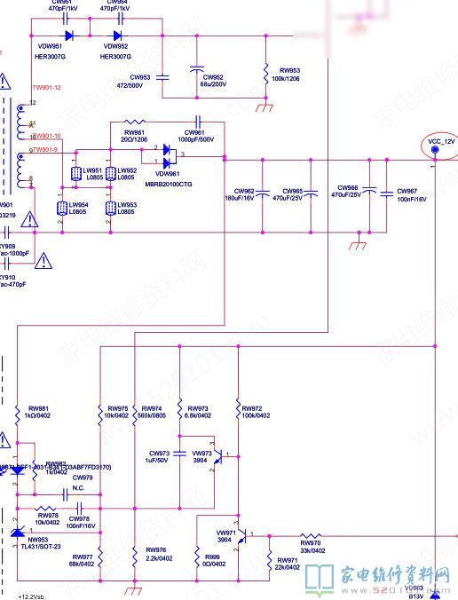最近接修一台康佳LED32F2200NE,故障为屏闪一下即灭。一看这种现象首先怀疑灯条不良,但用测灯仪检测没有问题,故障在恒流。测灯条电压开机瞬间电压升到160V左右便消失了,测前级供电电压89V,正常值应该为100V,怀疑100V取样电路有电阻变值,拆下贴片RW974\RW976正常,查看电路图,发现该机另一路12V也有取样电路连接到TL431,遂拆下RW975测量,103变成了9K左右且不稳定,从废板上拆下一个换上开机,100V恢复正常.可是灯条依旧是一闪即灭。