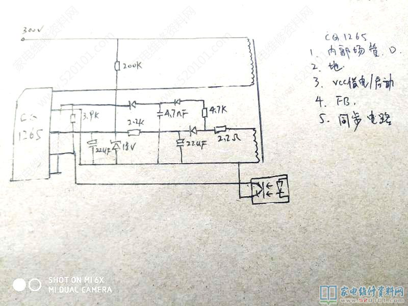 如上图所示,虚线内就是模块板图,拆掉原DM0465 装上CQ1265的1、2、4脚不用改,3脚原100Ω换成2.2K,22V稳压管换成18V,原来6脚的100K电阻换成200K,然后直接连到3脚,原板5脚空,正好引线去主板,主板反馈绕组加2个电阻,2个二极管和一个电容直连CQ1265的5脚,加装同步电路。