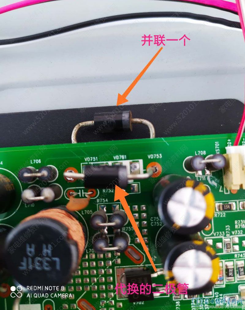 一台康佳LED50K35A液晶电视,故障表现为开机有声音、背光不亮,刚开始怀疑是背光灯的问题。经查维修资料,有的说此机背光不亮通病是VD753短路所致,开后盖直接测量果然是VD753(型号是SR5200)短路,因手头暂时没有此型号二极管,从旧板拆两个MUR460代换,考虑到MUR460比SR5200电流小,故用两个并联代换,连续开机4个小时代换的二极管微热,估计问题不大,希望大家遇到此机型不妨先测一下VD753,少走弯路。