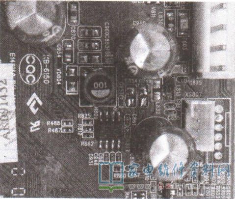 接修一台康佳LC32DS30型液晶电视,故障表现为上电后红色指示灯亮,二次开机后绿色指示灯亮,背光灯亮,灰屏,且无声音。拆机检查,测得主板(板号为35013951)上为液晶屏供电的场效应管N802( ME9436 )的S极电压为0V。继续顺着供电线路检查,发现12V供电电感L813烧毁且该引脚处线路板炭化,如图1所示,怀疑12V负载短路。分别断开L901(音频电路供电电感)、I850(_上屏供电电感)检测,确定短路点在L901后级。断开伴音功放N900( LA42205 )供电端⑨脚后,短路现象消失,由此判断N900损坏。更换N900及L813后试机,故障排除。