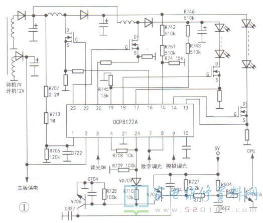 接修一康佳42J39AW型液晶彩电,开机后背光一亮即灭,但指示灯仍然是绿灯,此时键控、遥控均失控。从故障现象看怀疑LED灯珠有问题引起电路保护。用测试仪检测,两组灯条均正常,点亮电压为120V。该机采用三合一主板,开关电源输出两组电压,一组供应主板,一组供应背光。测量供应主板的一组电压,上电时为TV,然后升高到12V ,在背光亮时马上又降到7V。监测背光电路的供电电压以及LED灯条正端电压,发现开机后这两个电压。上升到120V时就迅速下降,看来背光升压电路没有工作。该机背光芯片采用OCP8122A,实绘其外围电路如图1所示(和OZ9902A芯片电路结构完全一样)。芯片②脚是故障状态输出,正常情况下是低电平。监测该脚电压,发现在背光亮时马上变为高电平。由于LED灯条正端电压只有120V,刚达到灯条点亮电压,所以怀疑过压保护电路误动作。