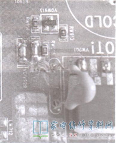 接修一台康佳LED32M280OPDE型液晶电视,上电后电源指示灯不亮,不开机。拆机,目测发现三合一主板(板号为35017405),上开关管VW901旁边的电容CW910(100pF/2kV)表面有裂纹,且引脚铜箔已打火烧坏,如图1所示。