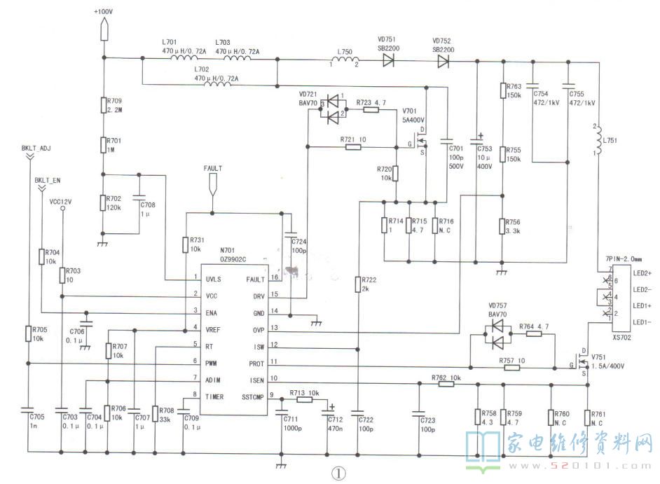 接修一台康佳LED32F3300CE液晶电视,故障现象是开机背光一闪即灭,但声音正常。该机三合一主板编号为35016968(图纸) ,其背光灯电路如下图所示。上电,测得插座XS702⑦脚电压由110V升到180V后又马上降到110V,说明自举升压电路已工作,怀疑灯珠异常,但用点灯仪检测,灯条发光正常。测量N701①脚(自举电路供电欠压检测端)电压为3.4V,②脚电压为12V ,④脚电压为5V,均正常,但⑥脚( PWM )电压仅为1.0V,外接一只22k2电阻到④脚,强制⑥脚为高电平,故障依旧。