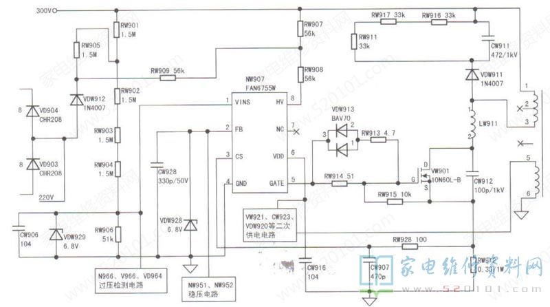 接修一台康佳LED32F3300CE液晶电视,故障表现为开机后自动关机。上电试机,监测开关电源输出的12V,电压在开机后迅速从12V降为0V,由此判定故障出在开关电源电路中。该机开关电源芯片采用FAN6755W(NW907),如下图所示,其①脚用作AC220V欠压及开关电源输出的12V、100V过压检测,当此脚电压低于0.7V或高于5.3V时,则判定AC220V欠压或12V、100V 过压,此时IC停止输出驱动脉冲。③脚为开关管VW901工作电流检测端,⑥脚为16V供电端。断开①脚外接三极管V966试机,故障依旧;断电后检测分压电阻RW901~RW906,未见异常;检查⑧脚外接降压电阻RW907 RW908,发现RW908虚焊,补焊后故障排除。