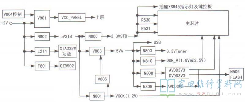 接修一台康佳LED32F2000E液晶电视,故障表现为二次不开机。上电,测得开关电源输出的12V正常,但开/待机控制管V811的基极电压始终为高电平,手摸主芯片MT8227外表无温升,由此判定主芯片未工作。该机主板的供电系统如下图所示,实测N802、N806,N801、N808、N809的输出电压都正常。