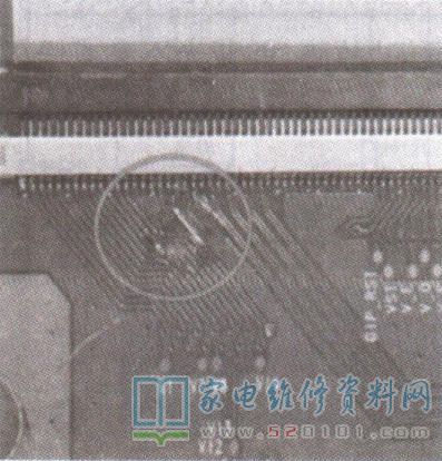 接修一台康佳液晶电视,其逻辑板号LC320EXN-SEA1-K31(6870C-0414A),故障现象是图像右边有镶边重影,如下图1所示,开机观察,图像的右边有镶边的干扰,按“菜单”键,显示字符也有镶边干扰,判断故障在后级电路。检测逻辑板上的各路电压都正常,把逻辑板到寻址板的排线也换向安装,故障不变。仔细观察,发现逻辑板输出端口CN5的插座附近有螺钉顶压的痕迹,如图2所示,且有一条线路铜皮已断裂,用万用表电阻挡测量,已经开路。刮掉绝缘漆,用导线过桥焊接后试机,故障排除。