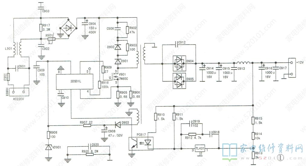 接修一台康佳LC-TM2011S型液晶电视,上电后无任何反应。拆机检查,电源板无12V电压输出。该机电源由芯片3DS01L和功率管7N60C组成,实测电路如图1所示。观察线路板,R907已烧黑测D903已击穿,3DS01L的⑦脚(供电端)对地在路电阻只有470Ω。断开⑦脚外围的c909及R908再测,对地电阻仍是470Ω。将芯片⑦脚与线路铜箔分离后,再测芯片⑦脚对地电阻正常,原来470Ω是烧黑的R907的阻值,估计芯片未烧坏。D903用RI207型二极管代换,R907用22Ω电阻代换后通电试机,电源板输出12V(正常)。连上主板试机,故障排除。