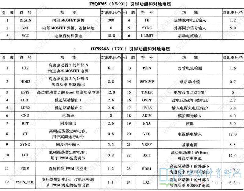 康佳34006383二合一电源板的集成电路引脚功能和对地电压见表1、表2。