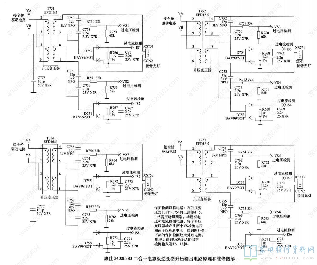 康佳34006383二合一电源板12V电源电路原理和维修图解如图3所示;逆变器振荡与全桥驱动电路原理和维修图解如图4所示;逆变器升压输出电路原理和维修图解如图5所示。