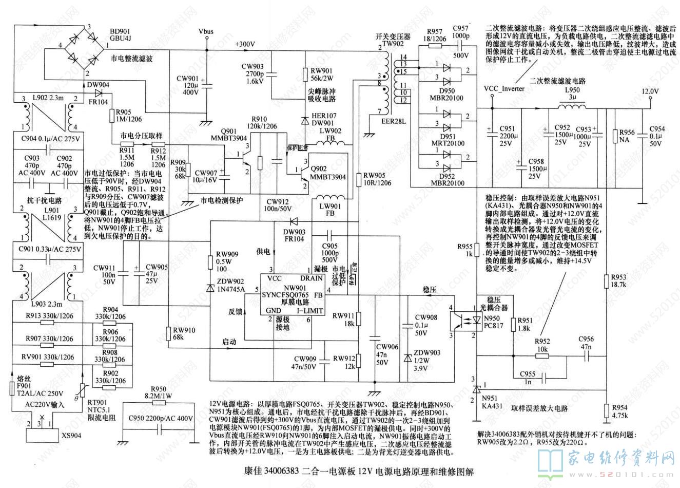 如果开机的瞬间有电压输出,然后降到0V,多为保护电路启动,-是NW901的过电压或过电流保护电路启动,主要检查取样误差放大电路的N951、N950 和分压电阻是否变质;二是检查市电欠电压保护电路,多为降压分压电路的电阻阻值变大。若LED指示管发光很暗,测电源12.ov输出低于正常值,则说明开关电源工作在窄脉冲激励状态,在光耦合器N950,误差放大器N951是否开路。R953、R054、R951、R955是否开路失效,上述元器件中有一只失效,都会使NW901的4脚失控,反馈电压大幅增高,内部MOSFET工作在低功耗弱振工作方式,直流输出电压大幅下降。