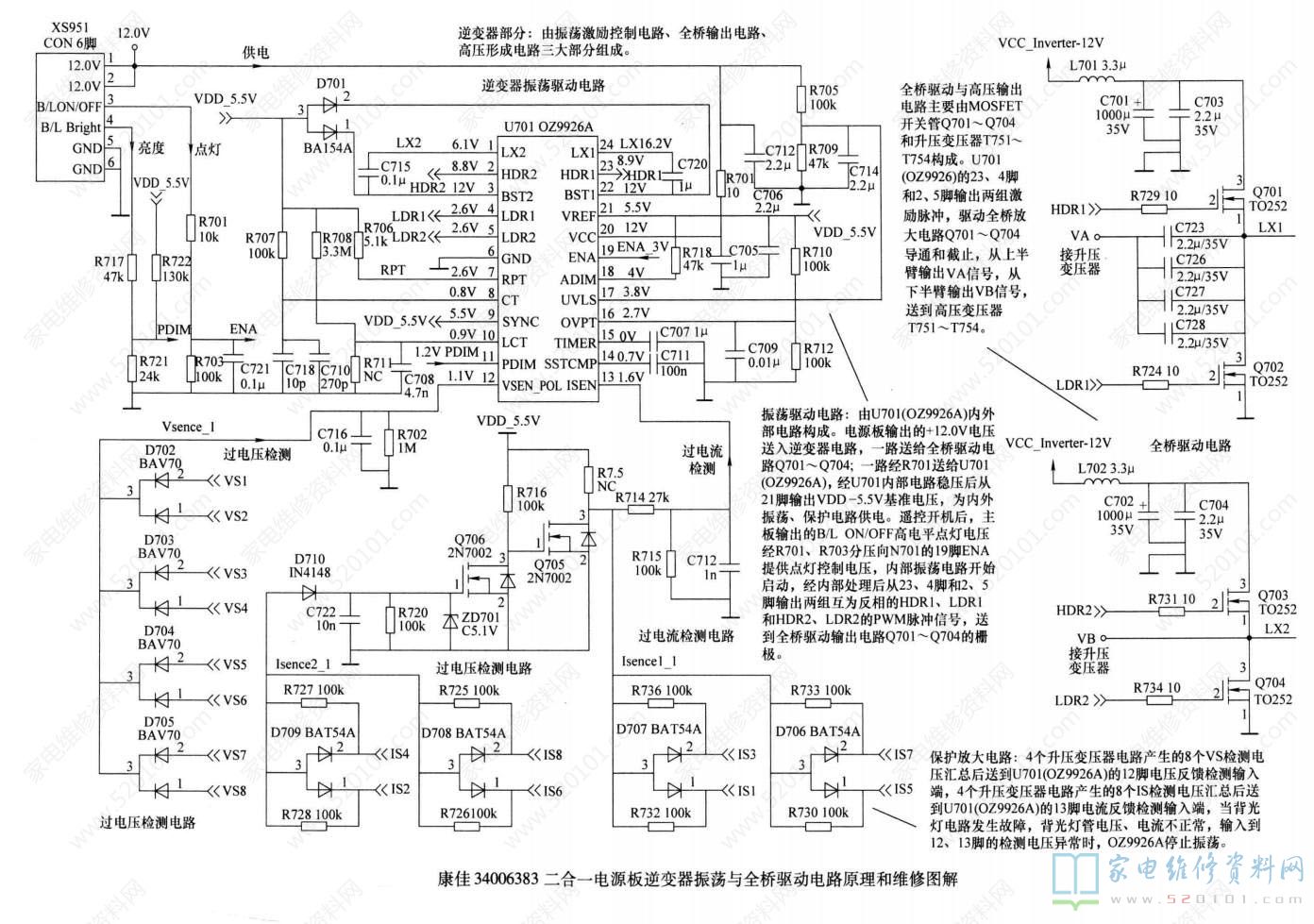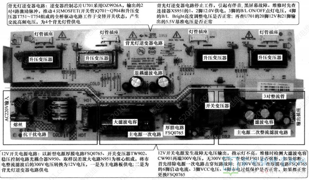 整个电源板由12.0V开关电源和背光灯逆变器两大部分组成。其中12.oV开关电源以新型电源厚膜电路FSQ0765、开关变压器TW902、稳压控制电路N950、N951 为核心组成,将市电整流滤波后的300V电压转换为12.0V的电压,一是为主电路板供电;二是为背光灯逆变器电路供电。逆变器部分主要由以OZ9926A (U701 )为核心的振荡激励控制电路、Q701 ~ Q704为核心的全桥输出电路、升压变压器T751 ~T754为核心的高压形成电路三大部分组成。