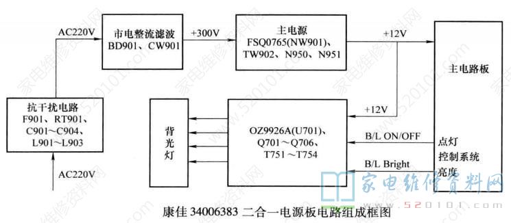 康佳34006383二合一电源板实物图解如图1所示;电路组成框图如图2所示。