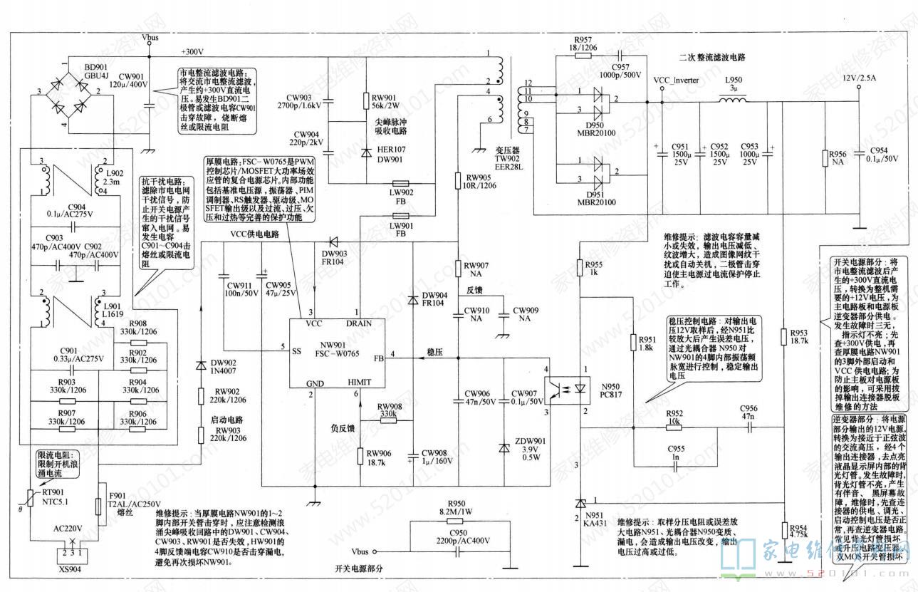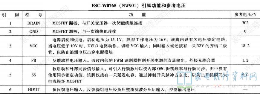 若熔丝F901熔断,则查整流滤波元器件BD901、Cw901 是否击穿漏电,若良好,则测量HW901的1-3脚对地电阻,正常为150kQ左右且有充放电现象。若正反向电阻值都很小且无充放电现象,可判断HW901内的MOSFET击穿,一定要检查TW902是否存在局部短路,浪涌尖峰吸收是否失效,HW901的4脚反馈端电容CW910是否击穿漏电。这些元器件中有一只失效,都可能损坏电源模块FSC-W0765。若熔丝P901完好,则检查启动电阻RW903、RW902 是否变质失效,HW901 的3脚VCC供电电路有无开路,查5脚软启动电容CW911是否击穿,必要时更换电源模块HW901。若输出电压低,LED发光很暗,应查光耦合器N950、误差放大器N951是否开路,R953 ~ R955是否开路失效。上述元器件中有一只失效,会使HW901的4脚失控,反馈电压大幅增高,内部MOSFET工作在低功耗弱振工作方式,直流输出电压大幅下降。