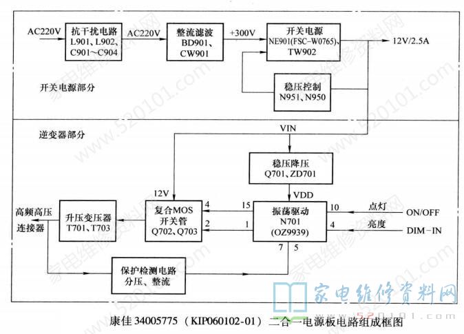 康佳公司34005775 ( KIP060102-01)二合一电源板,应用于康佳LC19AS69 (1、2BOM)、LC19AS69GV、LC19ES68Q、 LC19HS66、 LC19AS69B (1、2BOM)等液晶彩电中。康佳34005775(KIP060102-01)二合一电源板实物图解如图1所示;电路组成框图如图2所示。