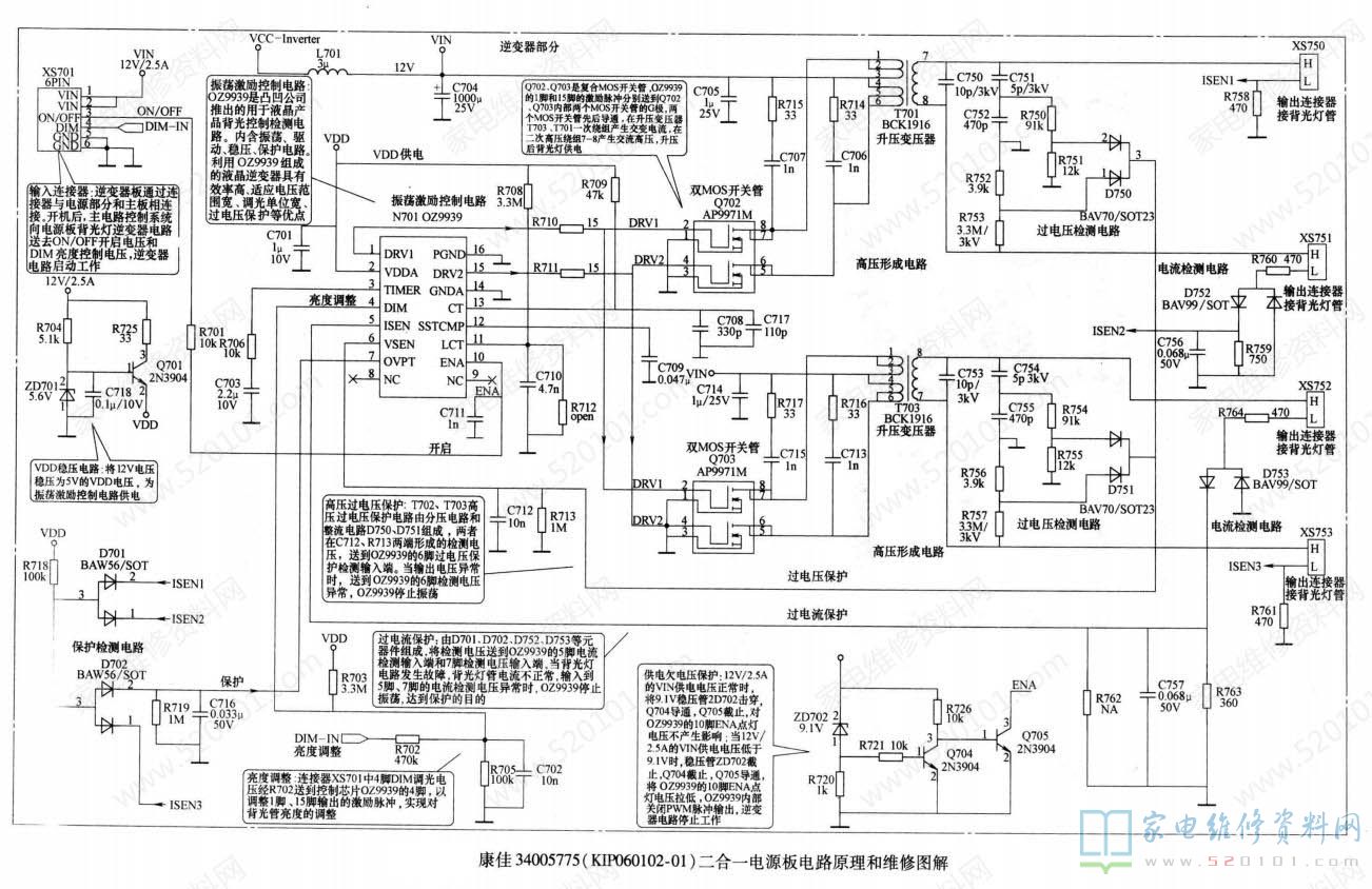该电源板分为两部分:一是以新型电源厚膜电路FSC-W0765(NW901)为核心组成的开关电源部分,没有PFC电路和副电源,电路简单可靠,输出+12V/2.5A电压,为主电路板和电源板上的背光灯电路供电;二是以驱动控制电路OZ9939 (N701) 和两只复合MOSFET (开关管)组成的逆变器电路部分,为4只背光灯管提供高频交流电源。