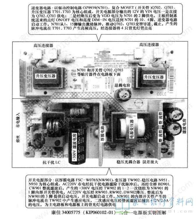 康佳34005775 ( KIP060102-01)二合一电源板引起的故障有: 一是开关电源部分无+ 12V直流电压输出,引发三无故障,LED无指示,般是FSC-W0765损坏或未能起振工作引起。这时检查熔丝F901是否熔断,判断故障范围。二是逆变器部分无高频高压输出,背光灯管不亮,引发黑屏幕故障,常见为背光灯管或升压电路故障。