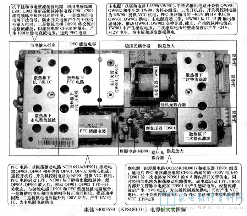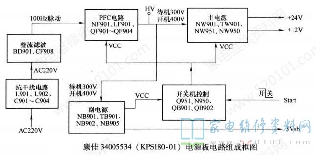 康佳34005534 ( KPS180-01)电源板实物图解如图1所示;电路组成框图如图2所示。