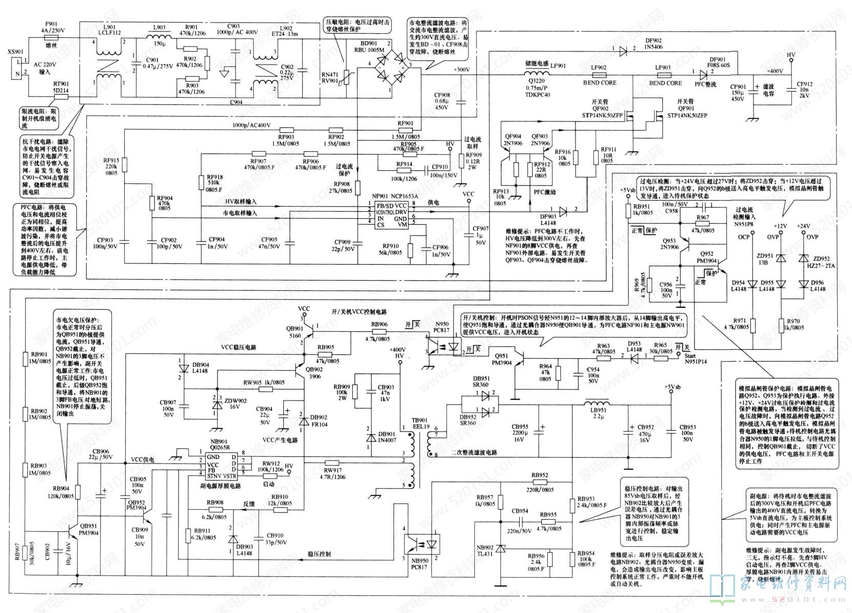 该电源板由三部分组成: 一是以NCP1653A (NF901) 为核心组成的PFC电路,将市电整流滤波后的电压提升到+400V,为主、副电源供电;二是以L6599 (NW901) 为核心组成的主开关电源,为主板负载电路提供+24V、+12V 电压,为主电路板和背光灯逆变器板供电;三是以Q0265E (NB901) 为核心组成的副电源电路,不仅为主板控制系统提供+ 5Vsb电压,还为驱动电路NCP1653A和L6599提供VCC工作电压。