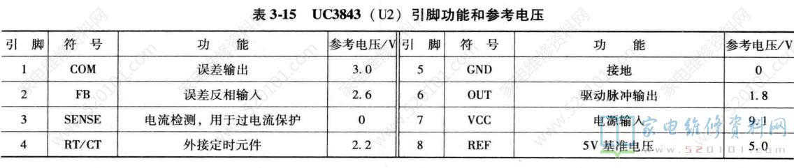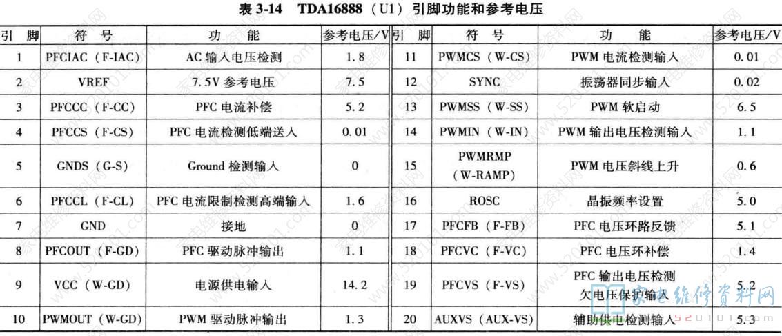 采用UC3843 + TDA16888组合方案有多种保护方案,一是在副开关电源一次电路,围绕驱动控制电路UC3843的保护功能,设有过电压、欠电压、过电流保护电路;二是在PFC电路和主开关电源,依托驱动控制电路TDA16888的保护功能,设有过电压、欠电压、过电流保护电路;三是在主开关电源的二次侧设有以模拟晶闸管电路为核心的过电流、过电压保护电路。上述保护电路启动时,开关电源停止工作。该电源板的集成电路引脚功能和参考电压见表1、表2。