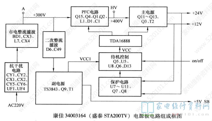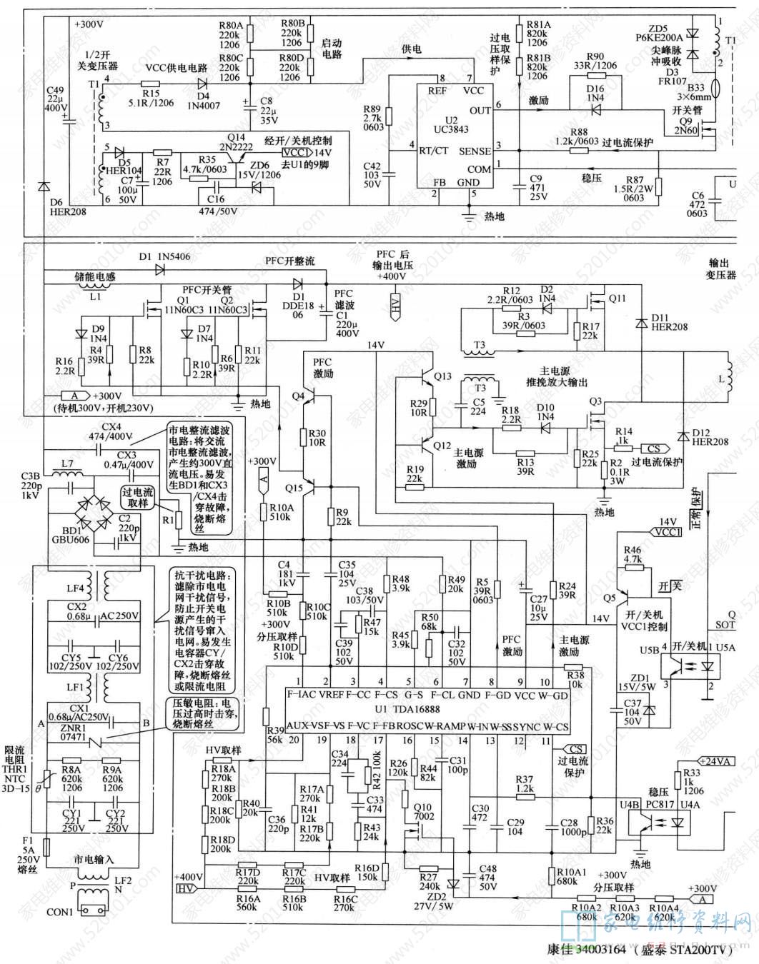 康佳液晶彩电采用的盛泰STA200TV电源板编号为34003164,集成电路采用UC3843+TDA16888组合方案。该电源板与34005243 (JSK3197-006)电源板可相互代换,应用于康佳LC-TM3719、LC-TM3211、. LC-TM3211GD、 LC-TM3211GV、 LC-TM3216、 LC-TM3218、 LC-TM3218PW、 LC-TM3228S、 LC-TM3711、LC-TM3711CD、LC-TM3718G、LC-TM3720等液晶彩电中。康佳34003164 ( 盛泰STA200TV)电源板实物图解如图1所示;电路组成框图如图2所示。
