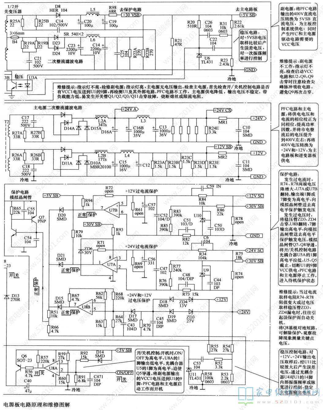 该电源板由三部分组成: 一是以驱动控制电路UC3843 (U2) 为核心组成的副开关电源,为主板上的微处理器控制系统提供+5VSB和+30VSB两组电压,同时为主开关电源驱动控制电路TDA16888(U1)提供VCC1工作电压;二是以TDA16888(U1)的1/2为核心组成的PFC电路,并将市电整流滤波后的低电压提升到+ 400V,为主电源供电;三是以TDA16888 (U1) 的1/2为核心组成的主开关电源,为负载电路提供+24V和+12V电压。