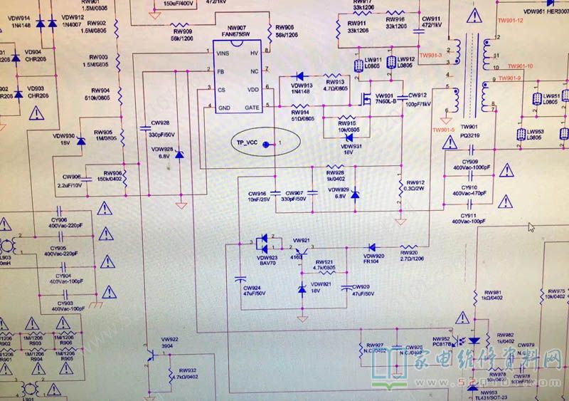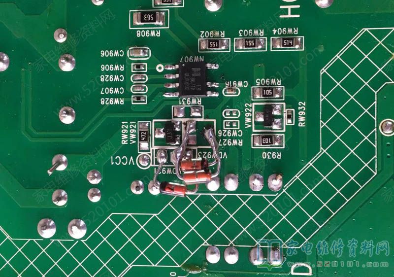 测光耦也损坏,其它正常,因为是过压保护,不影响工作,暂只是更换了光耦,接着查,测VW921三脚都通了,拆下,VDW921短路,VDW923短路,其它末见异常,估计FAN6755也不保,一起更换,VDW923有点特别,后用两个1N4148并联换上,VDW921没有贴片的就用常用的稳压二极管了,就是装上没那么好看。