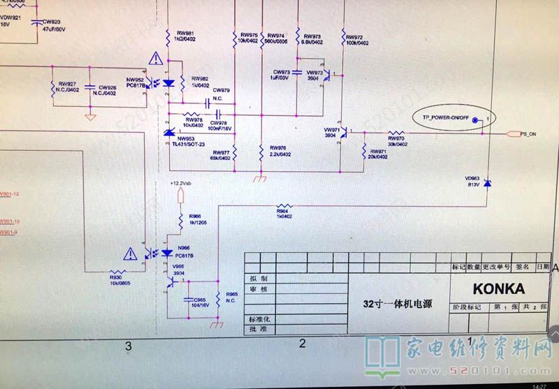 接修一台康佳液晶电视,型号是LED32F2200NE,客户说是雷击损坏,客户说让其他维修部看过说是要换板子,此机型采用的是35017012三合一板(图纸)。试机故障表现是上电开机没任何反应,目测电源部分保险丝完好,有一三极管炸飞,如下图所示。
