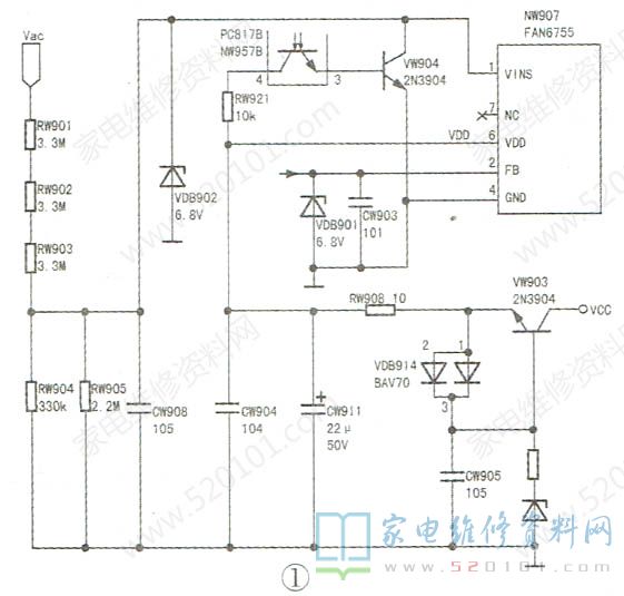 该机VDB914和VDB915图标型号为BAV70,实用A4t,这说明A4t为共阴极双二极管。实测VW903、VW967、VW964、VW953、VW962都为三极管,实用W1A28,其b、e极间正向电阻为7630,反向电阻为无穷大。根据原理分析,VW904应为三极管,这样才能通过光耦NW957(PC817)对NW907(FAN6755)的①脚( VINS )电压进行控制。查资料得知:2N3904耐压为40V,最大电流0.1A,最大功率0.25W。用耐压300V,最大电流0.1A,最大功率0.75W的2SC2271型三极管代换VW904后通电试机,故障排除。+12.2Vsb 输出电压为稳定的12.4V, VBL电压为稳定的98.8V。该机虽已修复,但心存疑惑:接修时,VW904无拆焊痕迹,疑似出厂原装。为何VW904误用为A4t还能正常工作多年?敬请赐教为盼。
