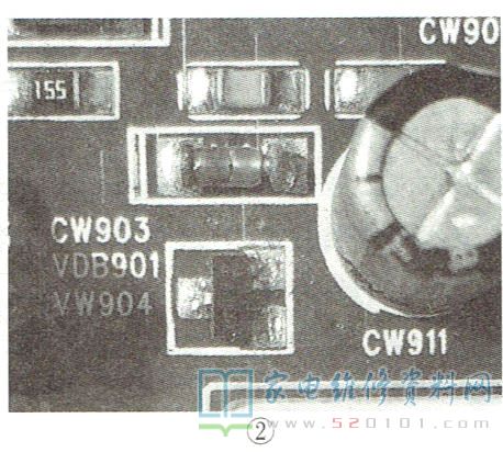 接修一台康佳LED40F2200NE型液晶彩电(主板型号:35017585),开机后图像、声音均正常,约一分钟后图像不停地跳动,声音时断时续。开机检测,背光时亮时灭,+12.2Vsb电压滤波电容CW962两端电压在10V左右波动,VBL( 100V )电压滤波电容CW961两端电压在90V左右波动。用DT9205型数字万用表二极管挡逐个检测电源电路中晶体管PN结的单向导电性,发现vw904的b-e结正反向电阻都为无穷大,明显异常。vw904在电路上的型号标注为2N3904(和vw903 vW967、VW964.VW953、VW962的图标型号都一样),如图1所示,但实际型号为A4t,如图2所示。