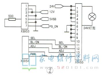 断开电源板上的+24V和+12V电压输出插座XS953、XS955的排线,在xs953的⑤、⑦脚之间接一只500Ω电阻,以强制开机;在XS955的24V输出端①、⑥脚之间接一只24V摩托车灯泡做假负载,如图2所示。