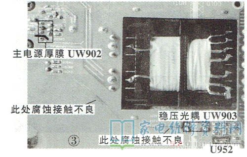 接下来将Q954的b极对地短接,手按住电源开关为电源板通电,发现+24V电压快速升到30V ,迅速断电。根据经验,稳压电路中的误差放大器和光耦易损坏。检查这部分电路,发现光耦UW903的③、④脚到主电源厚膜块UW902的②、⑥脚之间铜箔有腐蚀的痕迹,如图3所示。用细导线连接此部分电路后试机,故障排除。