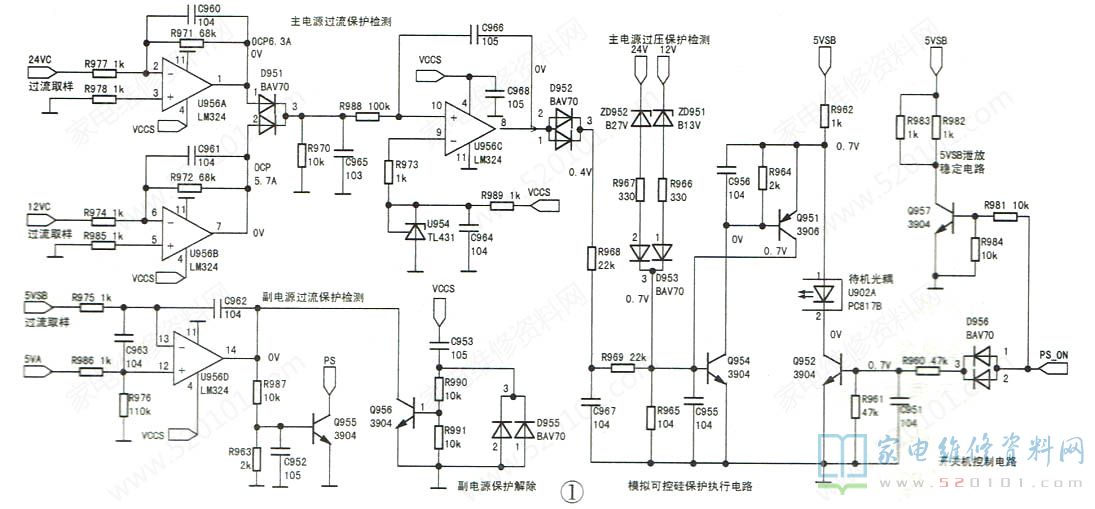 该机设有以模拟晶闸管Q951、Q954为核心的过流、过压保护电路,如图1所示。当发生过流或过压故障时,Q954的b极变为高电平,Q954、Q951导通,光耦u902因①脚电压过低而截止,开关电源进入待机状态。上电测得Q954的b极电压为0.7V,由此判断保护电路已启动。在开机的瞬间测得过压保护隔离二极管D953的正极电压约为0.5V,然后降为0V,由此判断过压保护电路已启动。
